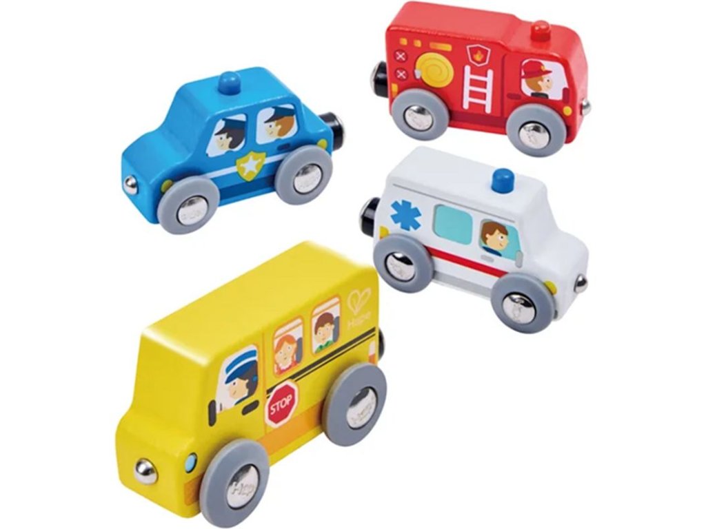 Sada 4ks městských dřevěných aut jako doplněk k vláčkodráze nebo samostatnou hru s auty. Prozkoumejte barvy a typy vozidel. V sadě najdete žlutý školní autobus, červený hasičský vůz, modré policejní auto a bílou ambulanci. Vozidla jsou kompatibilní se všemi vláčkovými sadami Hape a díky magnetům je můžete zapojit do jakékoliv vlakové soupravy. Vyrobeno z kvalitního FSC dřeva.