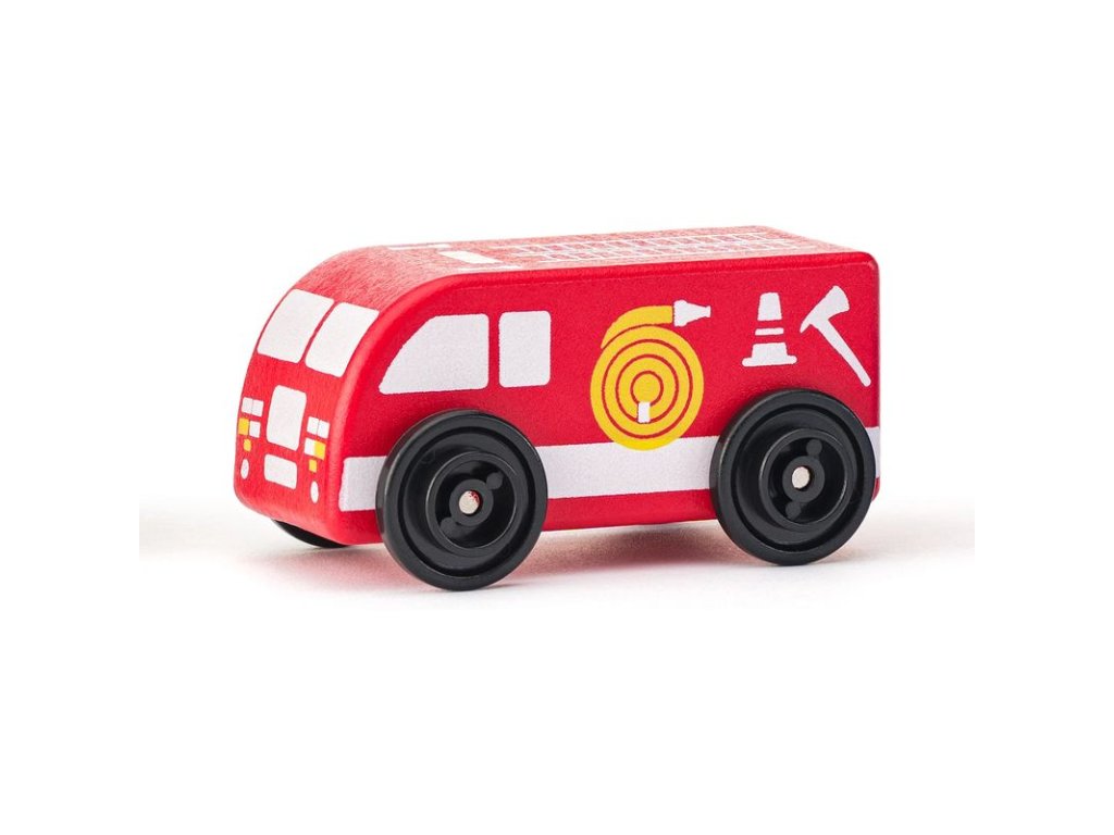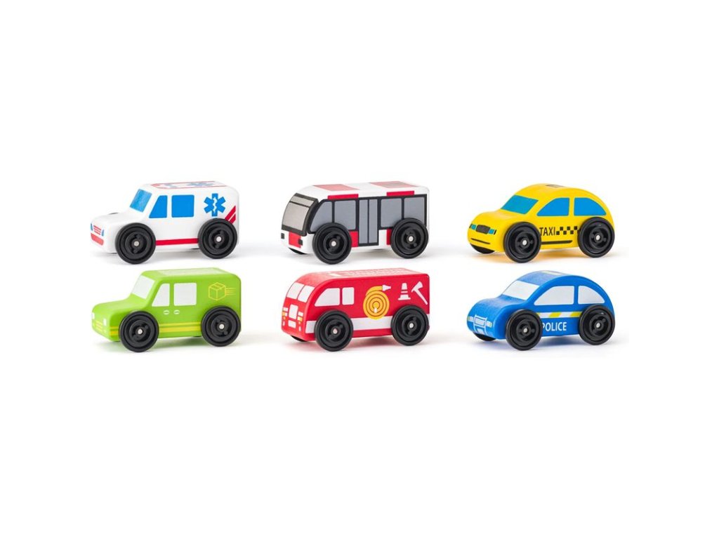 Dřevěná autíčka s plastovými koly jsou ideální pro nejmenší děti. Hasiči, sanitka, taxi, poštovní auto i autobus – každý vůz je připraven vyrazit na záchrannou misi nebo rozvážet cestující. Lehoučká, odolná a perfektní do malých ručiček!