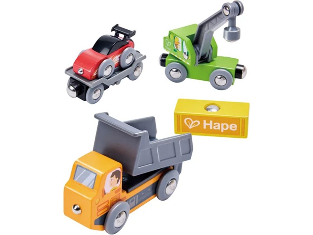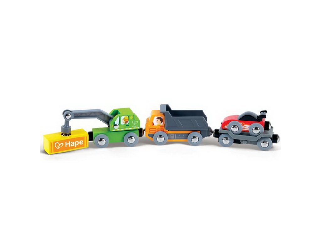 Sada 3ks stavebních dřevěných aut jako doplněk k vláčkodráze nebo samostatnou hru s auty. Tato sada vozidel se bude hodit na stavbě! V sadě najdete zelený jeřáb společně s nákladem, oranžové nákladní vozidlo a odtahový přívěs s červeným sportovním autem. Vozidla jsou kompatibilní se všemi vláčkovými sadami Hape a díky magnetům je můžete zapojit do jakékoliv vlakové soupravy. Vyrobeno z kvalitního FSC dřeva a plastu.