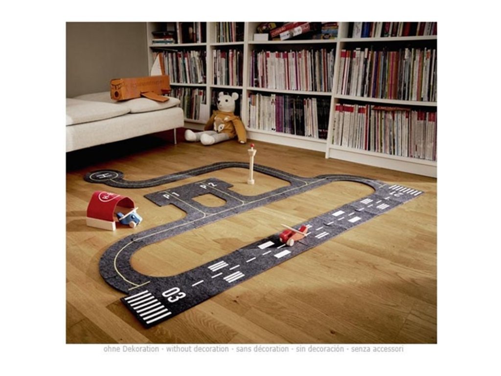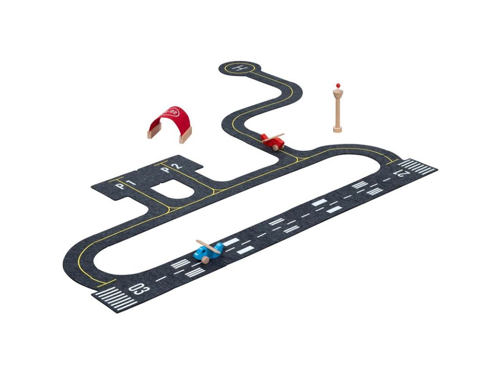 Sada s letištní dráhou a dvěma letadly ze dřeva, zahrnuje celkem 26 dílů. Můžeš celý svůj pokojíček proměnit v letiště! Na vzletovou a příletovou dráhu si vyhledej to nejlepší místo, aby tvoje letadlo nenarazilo třeba do skříně. Jednotlivé díly se k sobě jednoduše přikládají a existuje více možností, jak si můžeš letiště uspořádat. Řídicí věž, hangár a dvě letadla jsou součástí setu. Vyrobeno ze dřeva a filce. Vhodné od 2 let.