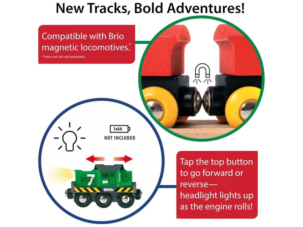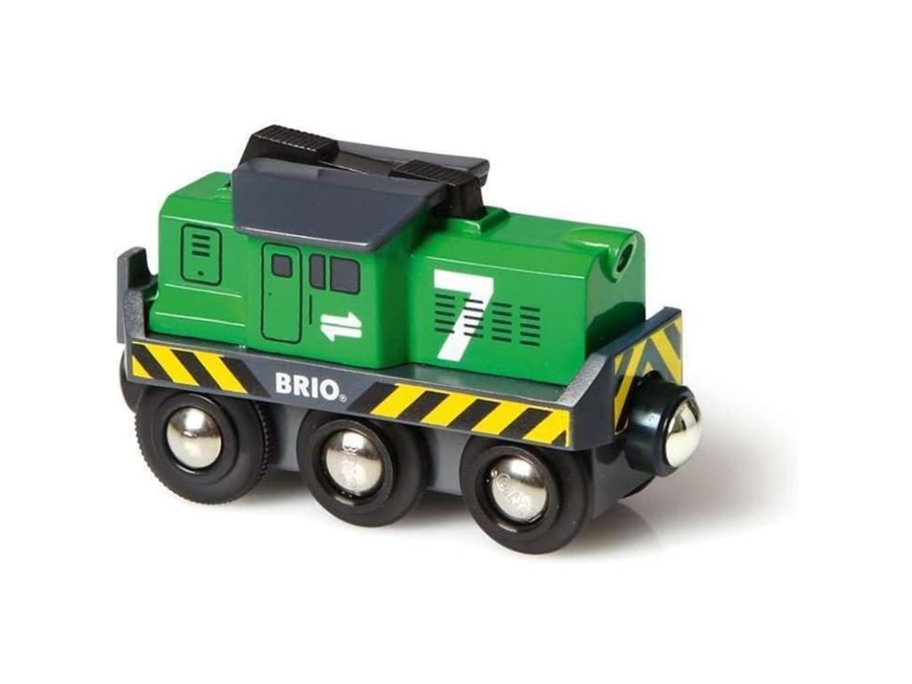 Sledovat lokomotivu jak projíždí, je někdy zábavnější než s ní přímo jezdit. Tato zelená mašinka má výkonný motor, který mu pomáhá vylézt kopce a rampy. Pohon vpřed a vzad a světlo. Tlačítko zapnutí/vypnutí je nahoře a lze snadno ovládat malými prsty. Baterie AA není součástí balení. Tato mašinka je kompatibilní s ostatními Vláčkodráhami Brio.