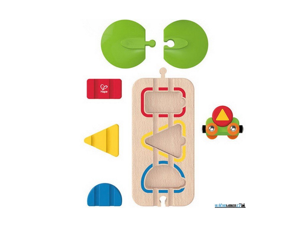 Dřevěný vláček projíždí po koleji a veze náklad. Na kolejích je možné vkládat 3 různé tvary. Dokud dítě tento hlavolam nevyřeší vlak nemůže jet. Zajímavé spojení dvou hraček v jednom. Děti si při hře procvičí svou zručnost, naučí se barvy a základní geometrické tvary.