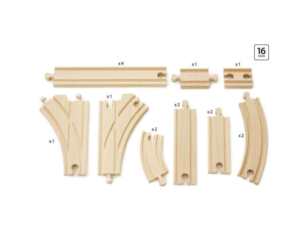 Set 16ks různých dřevěných kolejí jako doplněk k vláčkodráze. Jedná se o cenově výhodný set. Umožní stavění trati ve stále nových kombinacích.