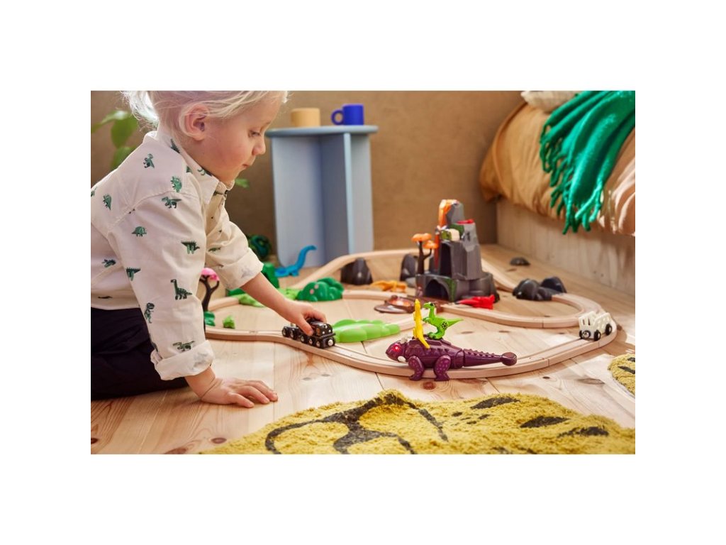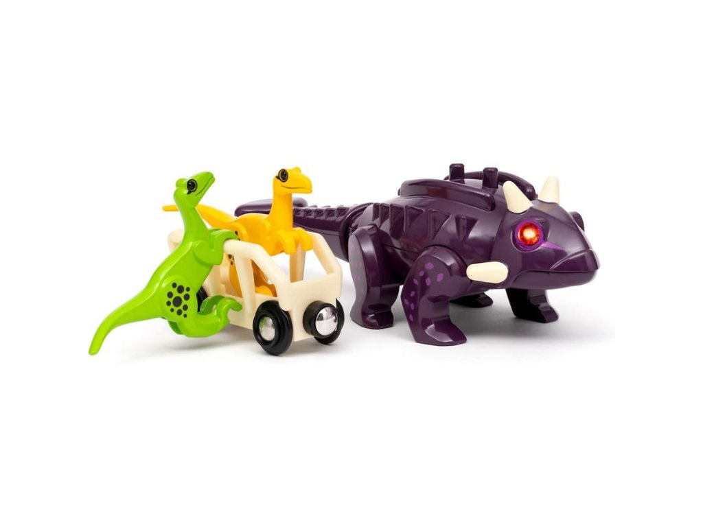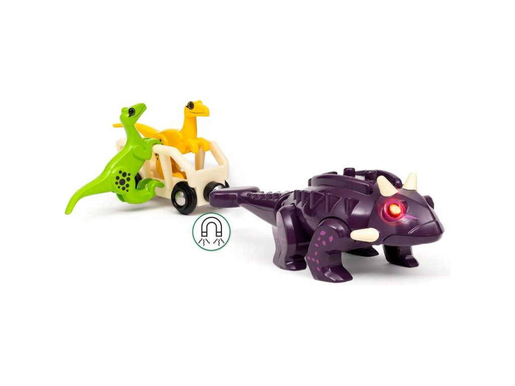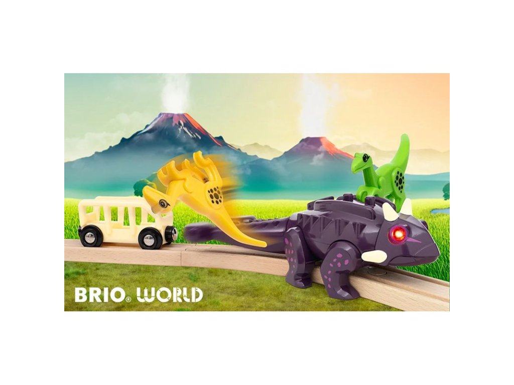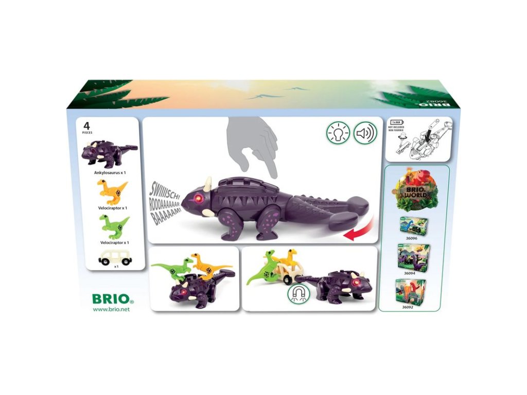 Mohutný dinosaurus, jenž dokonale zapadá do dřevěných vláčkodrah BRIO, ožívá díky červeným svítícím očím a řevu aktivovanému pohybem. Ankylosaurus má pružinový ocas připravený k švihu a dítě jím může povalit dvě barevné figurky velociraptorů, které jsou součástí sady. Magnet ukrytý v ocasu umožňuje tahat vagónky, podobně jako vláčky BRIO. Hračka je součástí řady BRIO World – Svět dinosaurů, kterou musí mít všechny děti milující dinosaury a vláčky.