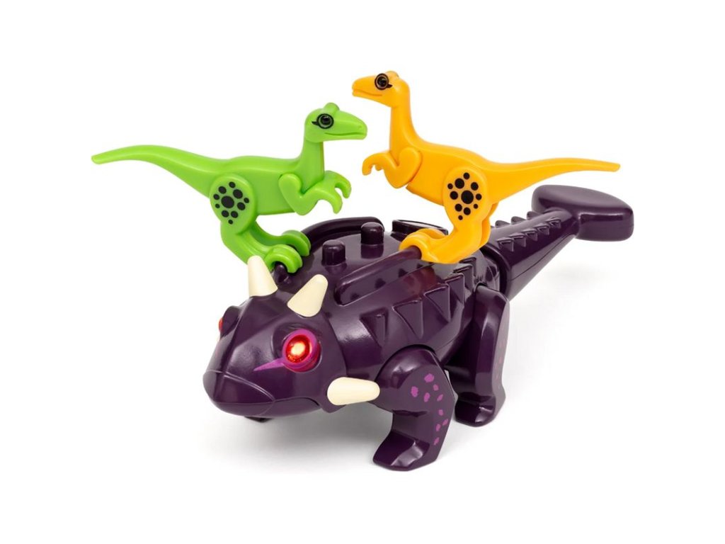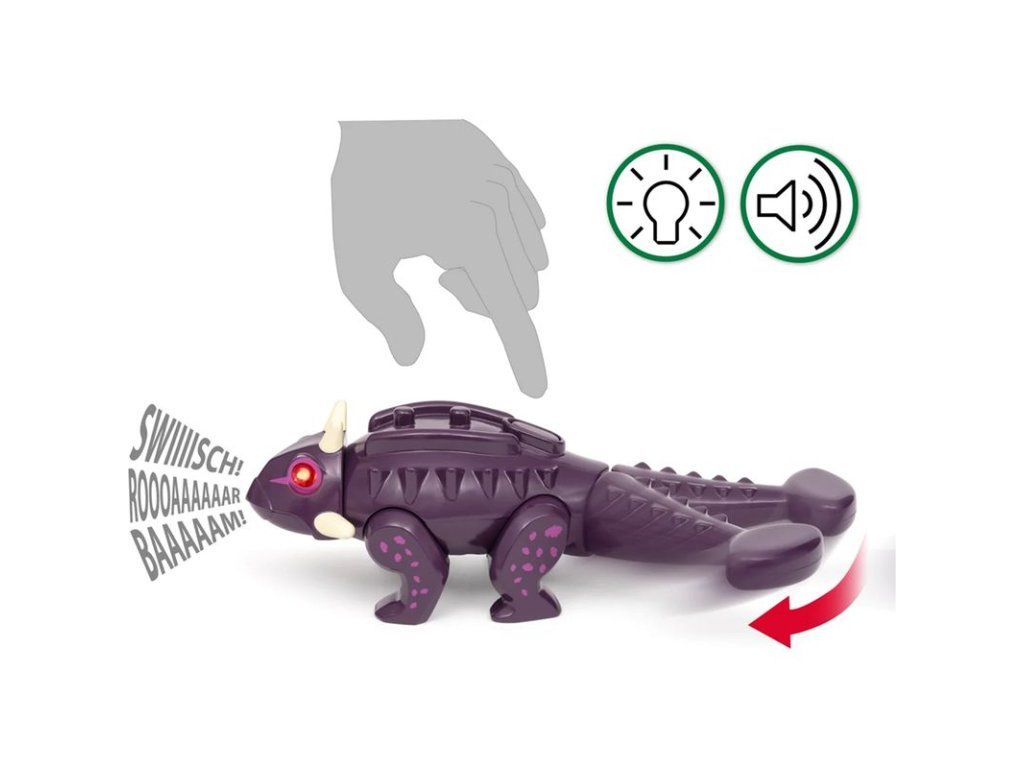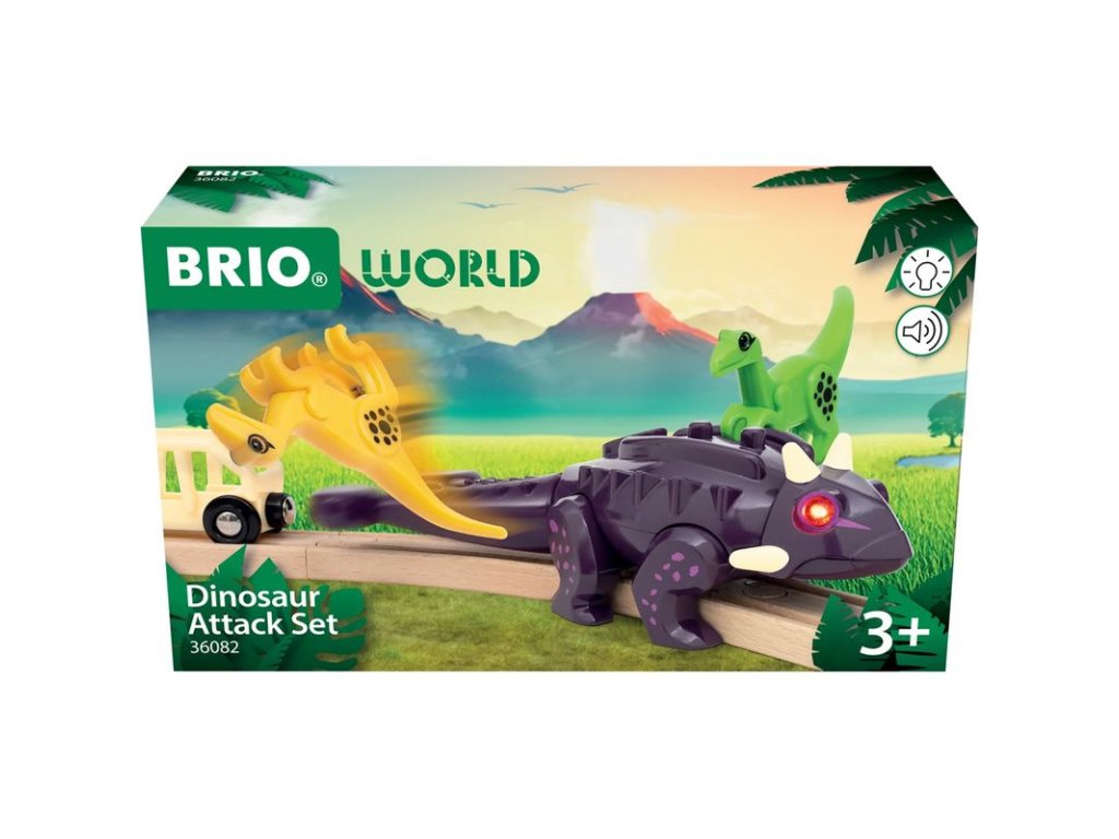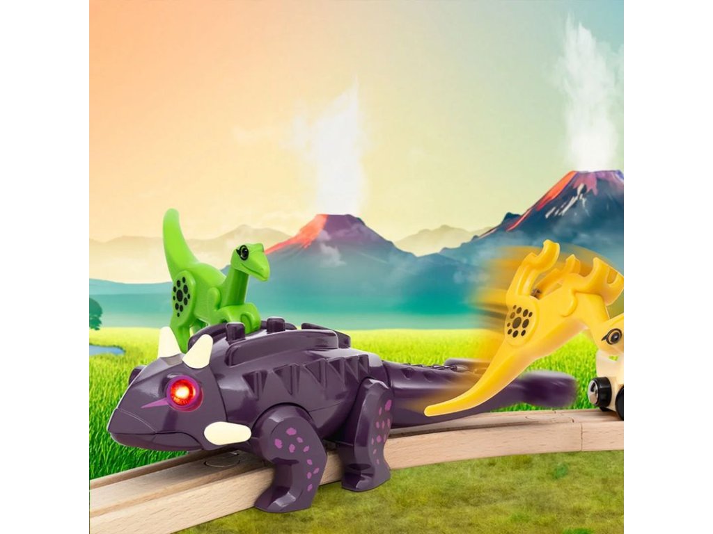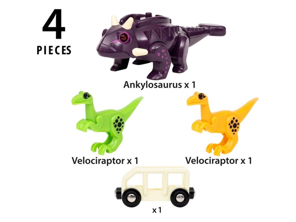 Mohutný dinosaurus, jenž dokonale zapadá do dřevěných vláčkodrah BRIO, ožívá díky červeným svítícím očím a řevu aktivovanému pohybem. Ankylosaurus má pružinový ocas připravený k švihu a dítě jím může povalit dvě barevné figurky velociraptorů, které jsou součástí sady. Magnet ukrytý v ocasu umožňuje tahat vagónky, podobně jako vláčky BRIO. Hračka je součástí řady BRIO World – Svět dinosaurů, kterou musí mít všechny děti milující dinosaury a vláčky.