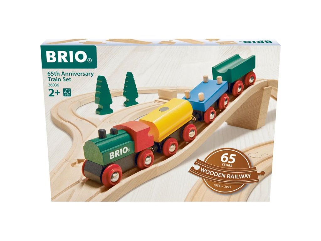 Oslava klasického vláčku se sadou k 65. výročí dřevěného vláčku. Vlaková souprava vyrobená výhradně ze dřeva je inspirována ikonickými železničními produkty BRIO, které byly poprvé uvedeny na trh v roce 1958. 32dílná sada je vyrobena z evropského bukového dřeva s certifikací FSC a obsahuje klasický vláček BRIO se 3 pestrobarevnými dřevěnými vagony, mostem, hroty a dřevěnými stromy pro scénickou dekoraci krajiny. Rozměry dráhy: 109x67x7,3cm.