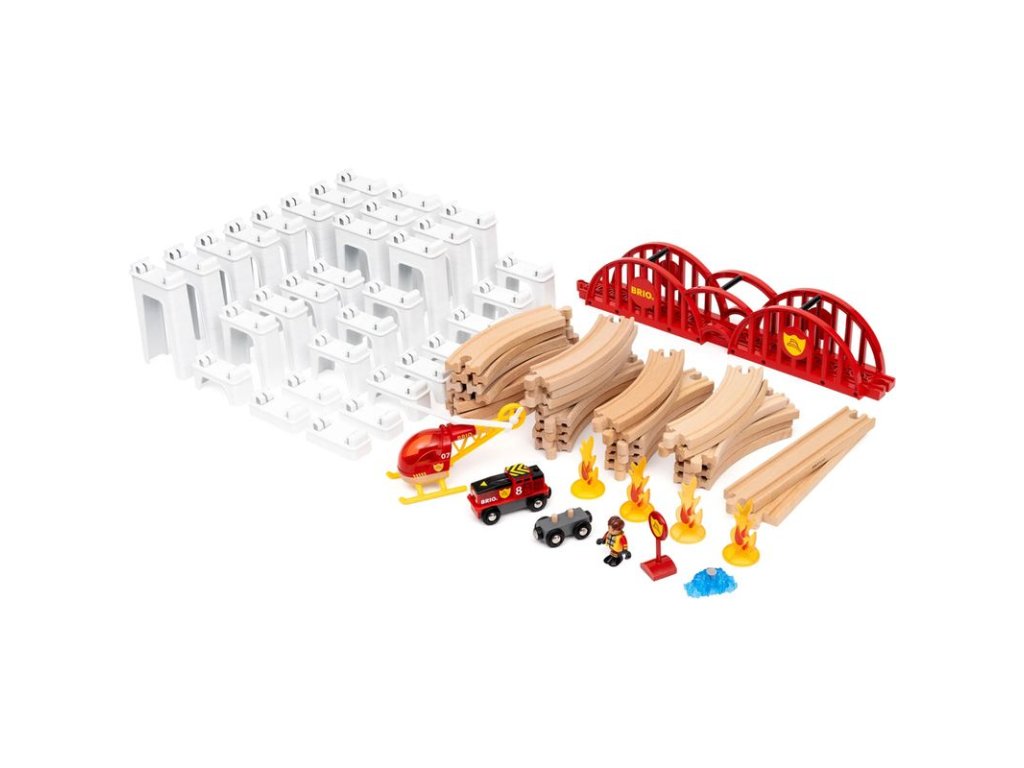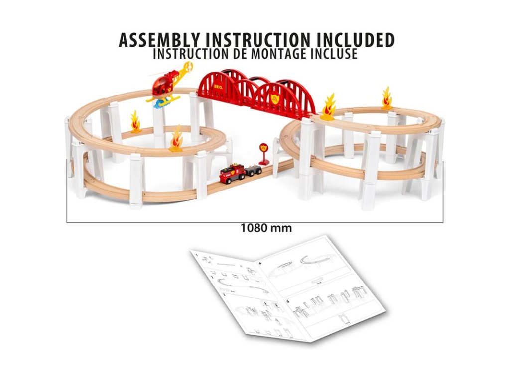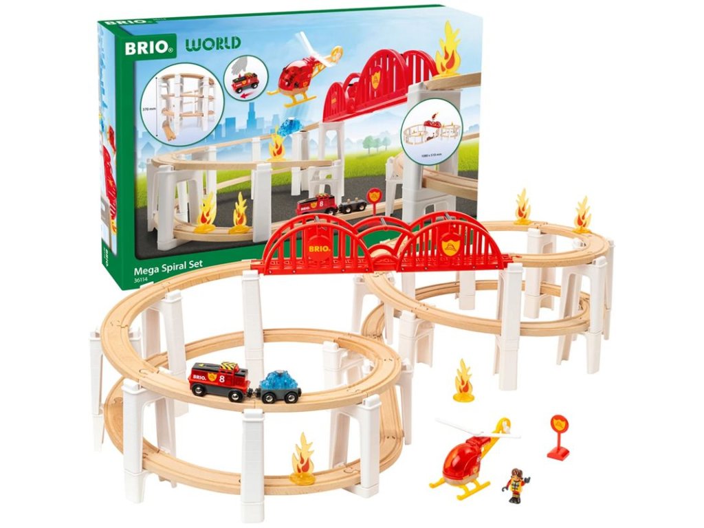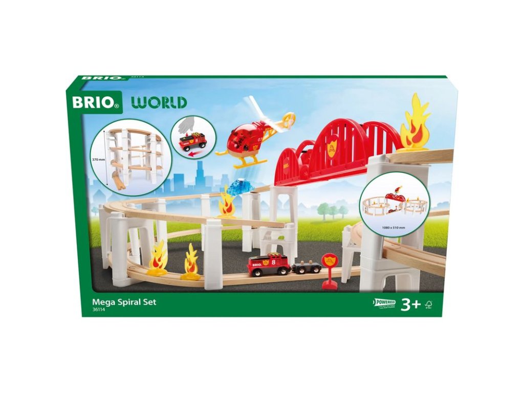 Megaspirála obsahuje 73 dílů: 32x modulární podpěry, 30x dřevěné kolejnice, 1x dlouhý červený most, 1x lokomotiva na baterie, 1x nákladní vagón, 1x náklad s vodou, 1x vrtulník, 1x figurka hasiče, 4x hasičské doplňky a 1x hasičská značka. Výška sestavené dráhy: cca 37 cm. Šířka sestavené dráhy: cca 108 cm. Baterie: 1x AA, není součástí balení.