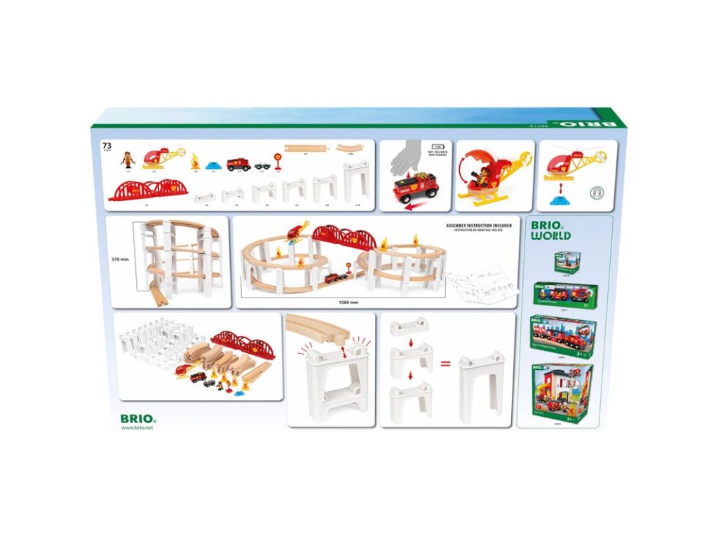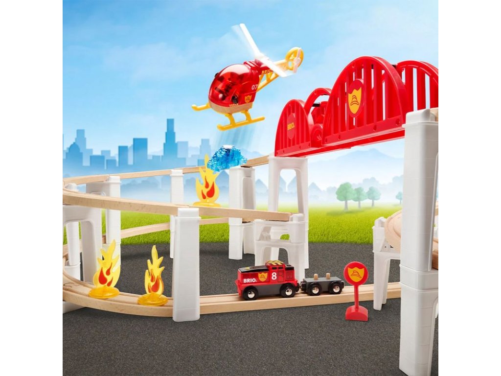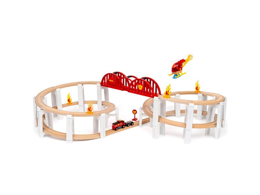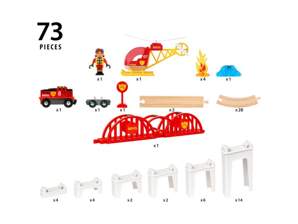 Megaspirála obsahuje 73 dílů: 32x modulární podpěry, 30x dřevěné kolejnice, 1x dlouhý červený most, 1x lokomotiva na baterie, 1x nákladní vagón, 1x náklad s vodou, 1x vrtulník, 1x figurka hasiče, 4x hasičské doplňky a 1x hasičská značka. Výška sestavené dráhy: cca 37 cm. Šířka sestavené dráhy: cca 108 cm. Baterie: 1x AA, není součástí balení.