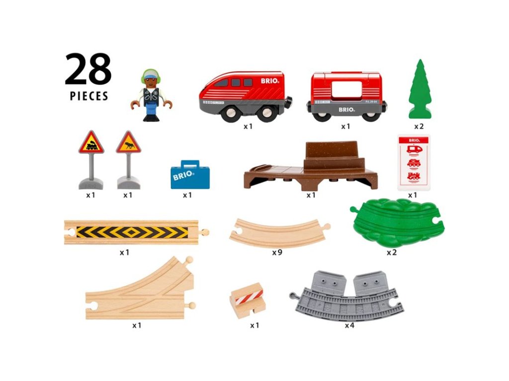 Sada obsahuje 28 dílů: 1x natahovací vláček, 1x vagon pro cestující, 1x figurka cestujícího, 1x nástupiště, 4x kolejnice, 2x dřevěný strom, 2x scénické kolejnice, 12x dřevěné kolejnice a spoustu dalšího příslušenství.