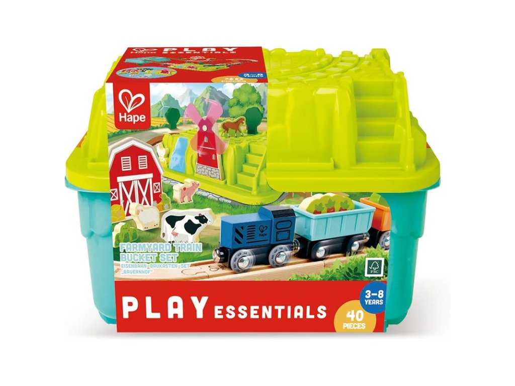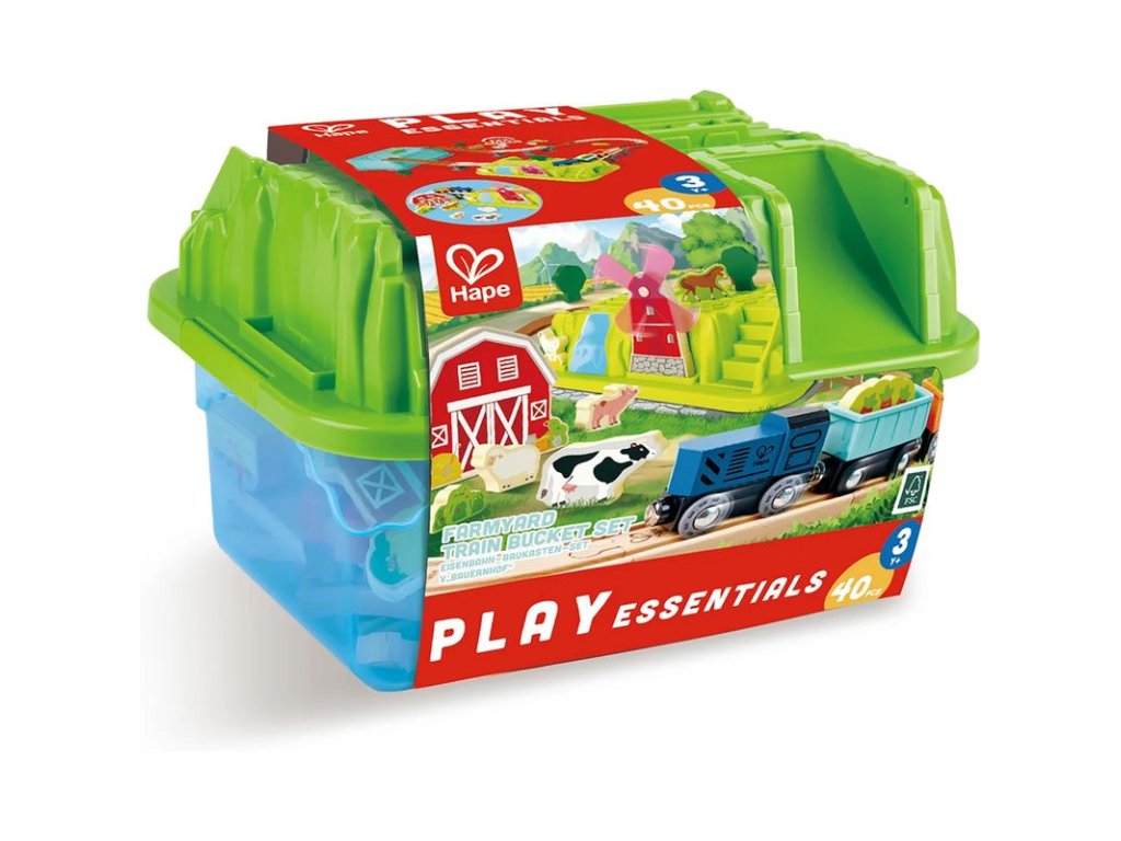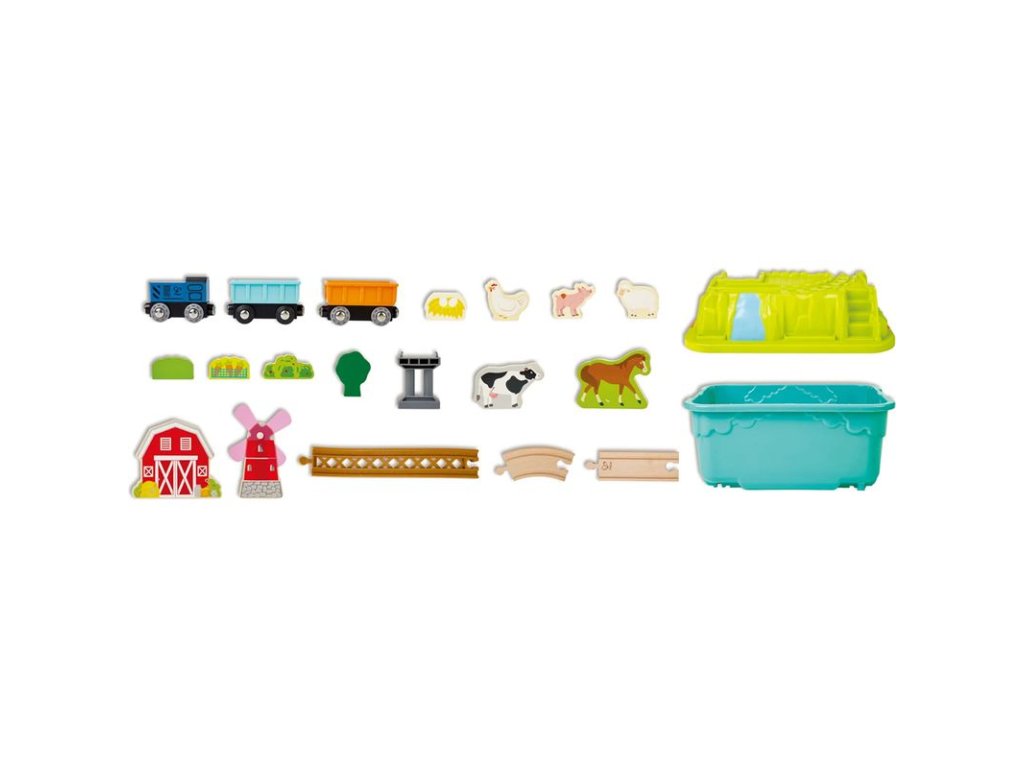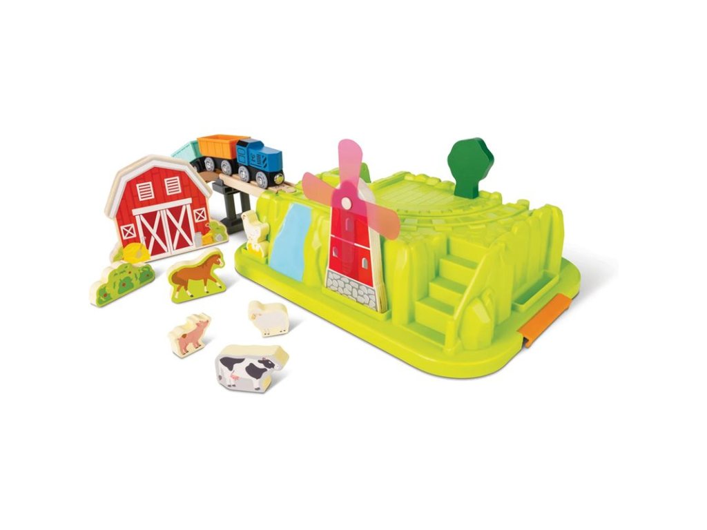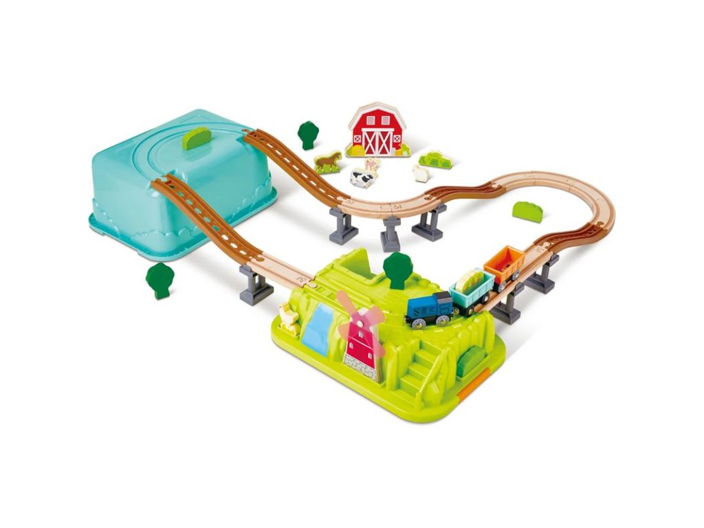 Tato vláčkodráha je na motiv farmy a života v něm a umožňuje dětem hravou formou poznat život na vesnici. K tomu slouží lokomotiva, nákladní vagóny pro přepravu zvířat a sena, figurky zvířat a další užitečné doplňky. Dvůr farmy je znázorněn stoupáními, klesáními, mlýnem a stodolou. Mezi zvířaty najdete prasátko, krávu, koně, ovci a slepici s vejci. Nechybí ani malé stromy a zeleninové záhonky uvnitř dvora. Po hře lze díly uložit do boxu, který se po otočení vzhůru nohama stane součástí herní scenérie. Sada rozvíjí fantazii, sociální dovednosti i spolupráci, při stavění tratě učí samostatnosti. Koleje jsou kompatibilní s vláčky Hape a Brio. Vyrobeno z bezpečných materiálů.