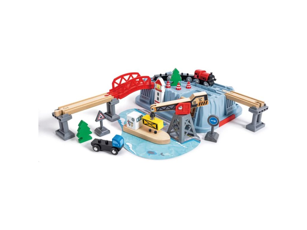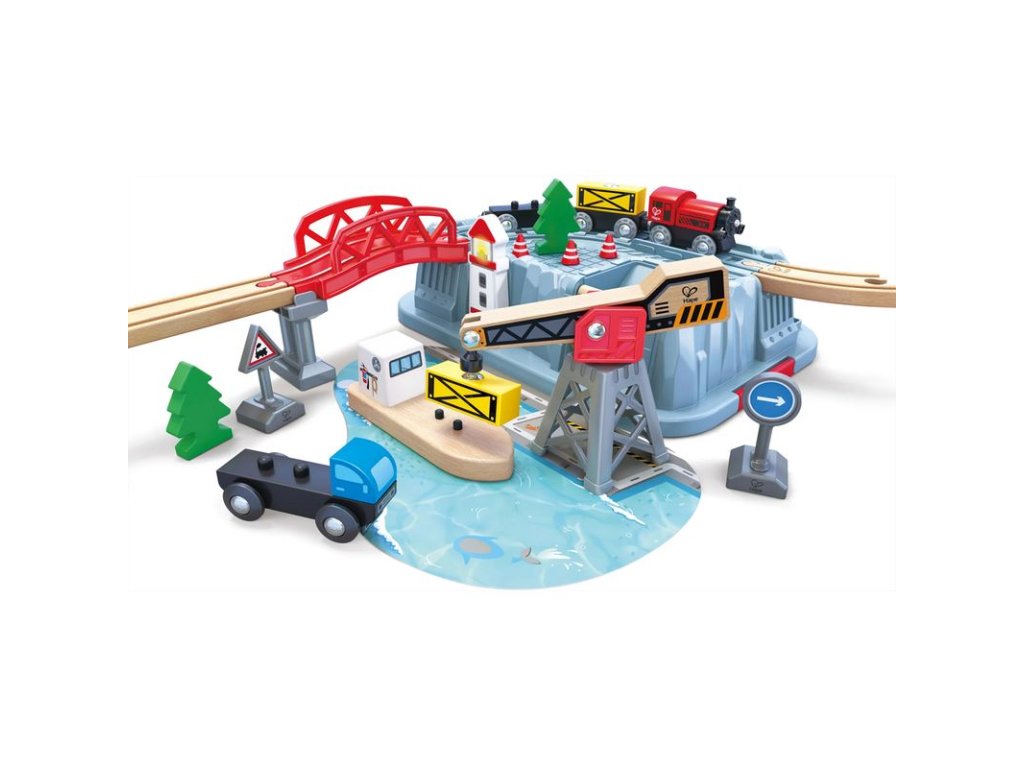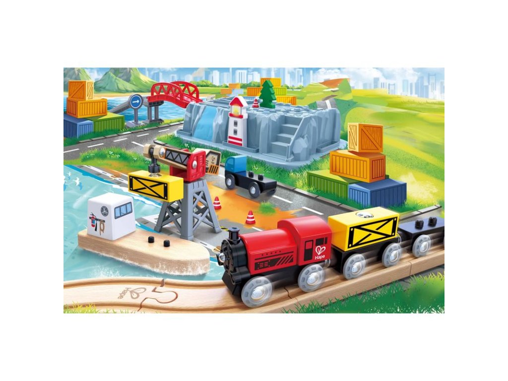 Tato vláčkodráha je na motiv přístavu a dopravy v něm. S touto krásnou vláčkodráhou si vaše ratolest užije dobrodružství, které se děje v přístavu. Pomocí jeřábu naloží důležitý náklad z lodi do vlaku a zpět. Po hře lze díly uložit do boxu, který se po otočení vzhůru nohama stane součástí herní scenérie. Sada rozvíjí fantazii, sociální dovednosti i spolupráci, při stavění tratě učí samostatnosti. Vlak, vagony a kolejnice v sadě jsou kompatibilní se všemi lokomotivami, příslušenstvím a vláčkovými sadami Hape. Vyrobeno z kvalitních materiálů. Sada obsahuje: Lokomotivu Tap & Go, vagónky, kolejnice, jeřáb, přístaviště s lodí, most a další doplňky.