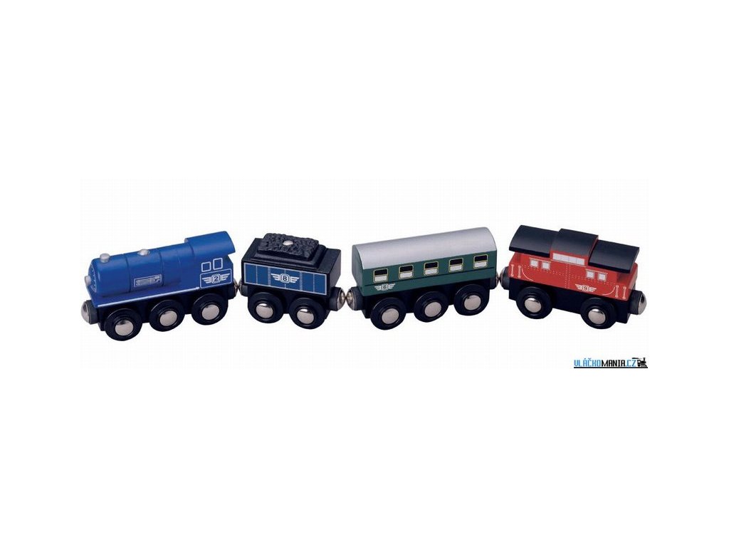 Souprava dvou osobních vagónů, vagónku s uhlím, poháněná silnou parní lokomotivou, bude jistě příjemným společníkem na cestách. Délka celého vláčku je 32cm.